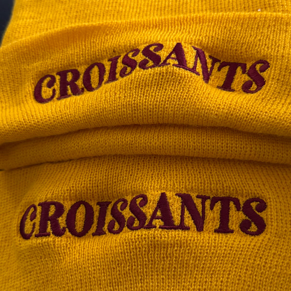 Croissants beanies-two available, no major flaws just overall a bit stretched out, embroidery a little too tight causing bunching